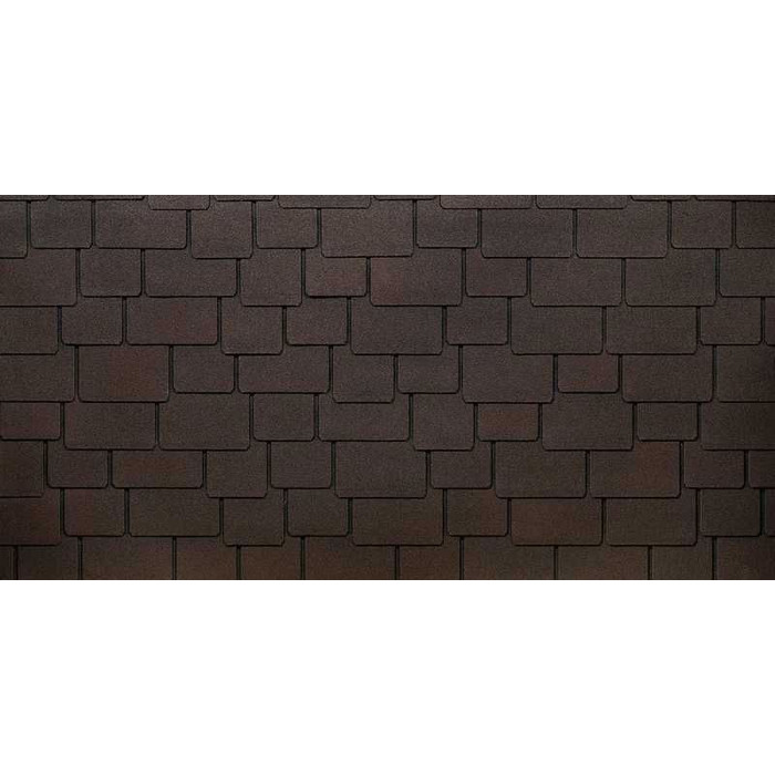 Насыщенный каштановый оттенок с легким переходом цвета в затемнение смотрится благородно и очень дорого. Изюминка дизайна – лепестки разной ширины и длины. Черепица отлично гармонирует со светлым бежевым сайдингом, фасадными панелями под сланец, песчаник, юрский мрамор.