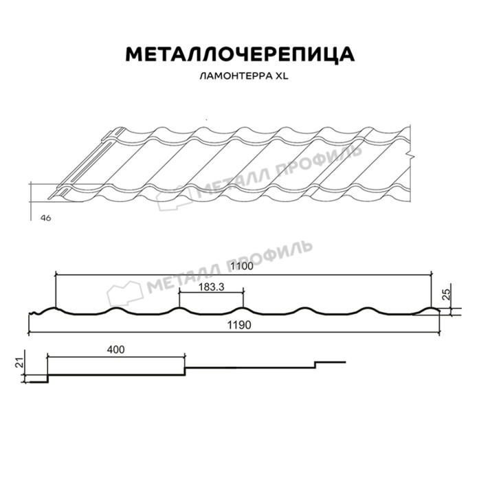 Если вам нужна классическая металлочерепица для крупных крыш, остановите выбор на Ламонтерра® XL. Она характеризуется увеличенными размерами: длина ступенек — 400 мм, а высота — 21 мм. Крупные плавные волны подчеркнут форму ската и сделают крышу более эффектной.