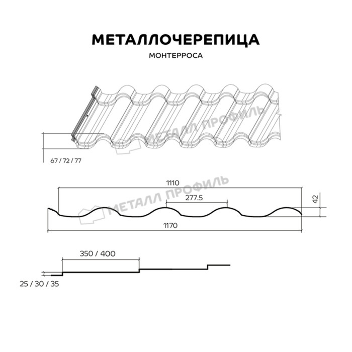 В 2018 году компания «Металл Профиль» выпустила новый продукт. Это один из самых глубоких профилей — его высота достигает 77 мм. В сочетании с технологией горизонтального 3D-реза он напоминает натуральную керамическую черепицу, весьма популярную в Европе. Комбинируя различные ступеньки, вы сможете подобрать для себя оптимальный вариант, который обеспечит вашему дому неповторимый внешний вид. К примеру, на длинных скатах кровли выигрышнее будут смотреться максимальные размеры профиля Монтерроса®. Чтобы обеспечить водонепроницаемость металлочерепицы, мы усовершенствовали форму бокового соединения. Его умеренная ширина увеличивает рабочую площадь листа. Металлочерепица Монтерроса® изготовлена из качественного сырья, что обеспечивает высокое качество товара.