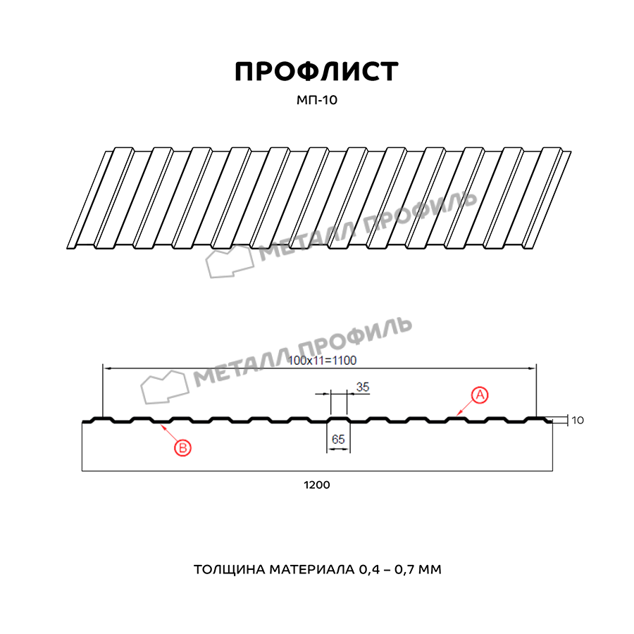 Профилированный лист МП-10x1100-B (PURETAN-20-RR23-0,5) — популярный материал в Мге для монтажа забора. Представляет собой стальной оцинкованный лист с покрытием. Общая толщина стальной основы с оцинковкой и защитно-декоративным покрытием — 0.5 мм.После проката на специальном оборудовании сталь приобретает рисунок из повторяющихся волн. Несущая способность профилированного листа на порядок выше плоского.
